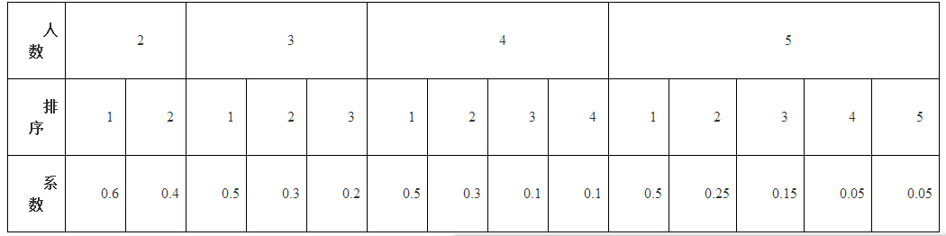 2.二级学院(部)、有关处室核对本部门有关项目的分值无误后,由项目负责人进行分配,分值保留到小数点后一位。多人合作项目,由主持人列出所有参与人的姓名和排位(原则上,包括主持人在内总数不超过5人,如超过5人的,由主持人对应总量进行分配),提出具体的分配意见,负责人不分配的,由教务处根据排位按照下表分解计算。