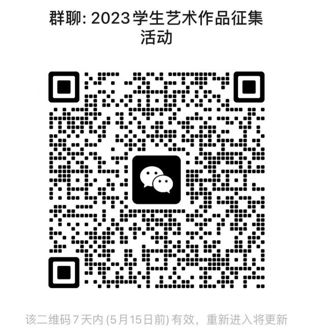 请同学们积极参与,有意向的同学扫码入群,并于6月5日前将作品电子稿、学生艺术作品征集登记表(附件1)、学生艺术作品征集汇总表(附件2)和XX学院参与情况汇总表(附件3)四样材料打包后(命名:班级 姓名 作品名称)发送到邮箱yishuxueyuan525@163.com。