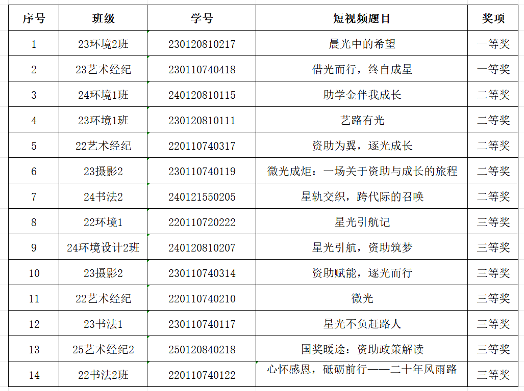 各班同学: 根据《“星光引航,资助筑梦”AI短视频创作大赛通知》,经学生个人提交参赛作品,经学院专家评审,现将“星光引航,资助筑梦”AI短视频创作评选结果公示如下: 获奖名单公示时间为2025年12月12日到2025年12月14日,如有异议,请实名反馈,联系人:谢老师,电话:0571-87557481,邮箱:yishuxueyuan525@163.com 艺术学院学生工作办公室 2025年12月12日