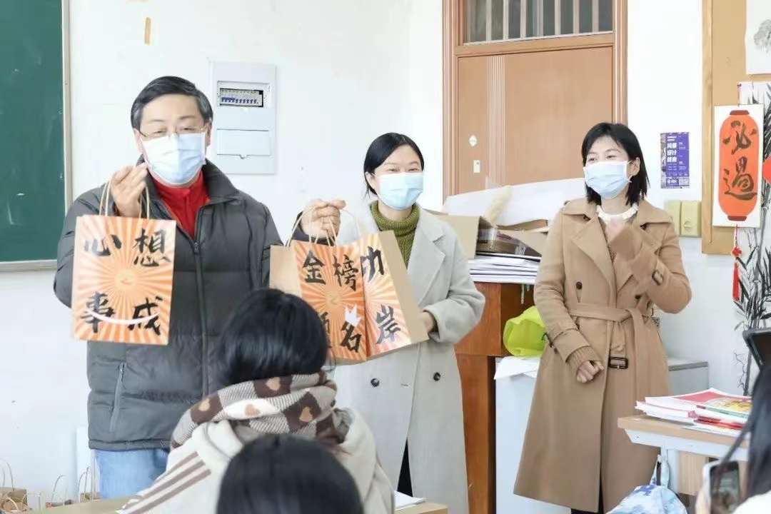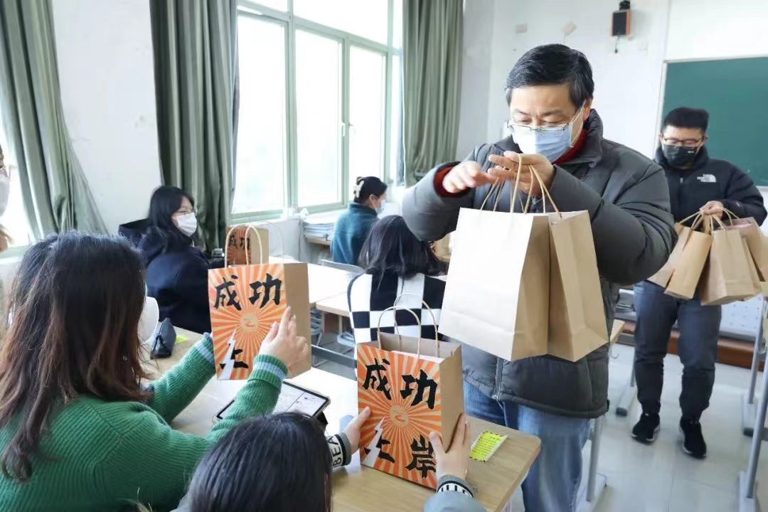 声声祝福过后,同学们也收到了老师们亲手送的学院的温暖慰问品,传递着学院老师们对大家真挚的祝愿和美好的希翼。其中的定胜糕也有着必胜的寓意,希望同学们在接下来的考试中都能够一举拿下,胜利夺魁!