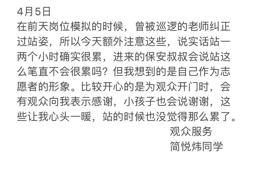 1、来自观众服务领域的小青荷简悦炜同学,用日记记录下服务过程中的小暖意。