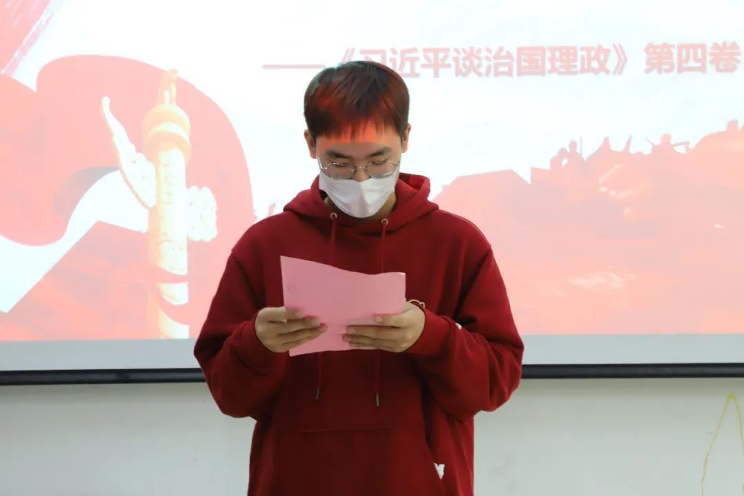 会议伊始,学生会执行主席刘诗喆提出《习近平谈治国理政》第四卷的出版背景是迎接党的二十大,这具有事关党和国家事业的继往开来,事关中国特色社会主义的前途命运,事关中华民族的伟大复兴的意义。