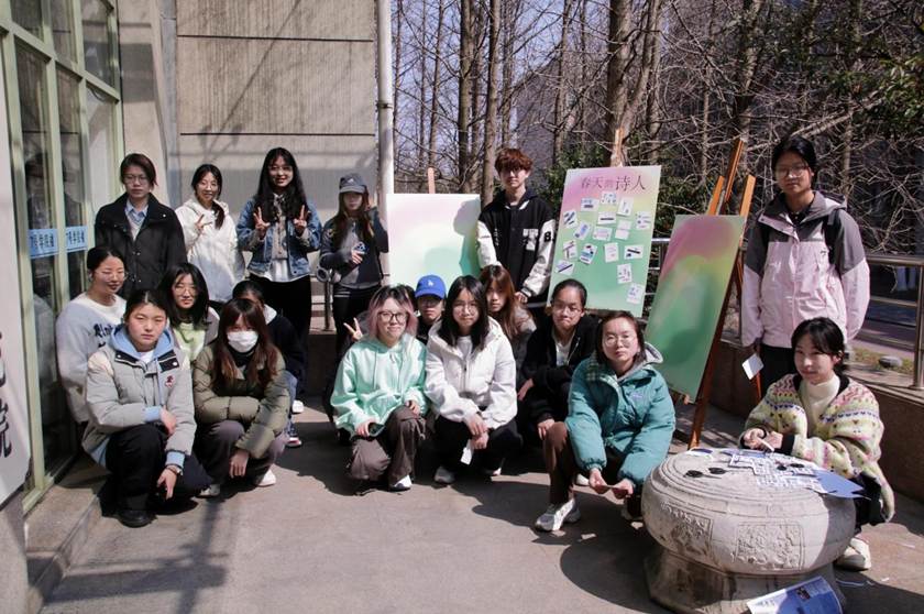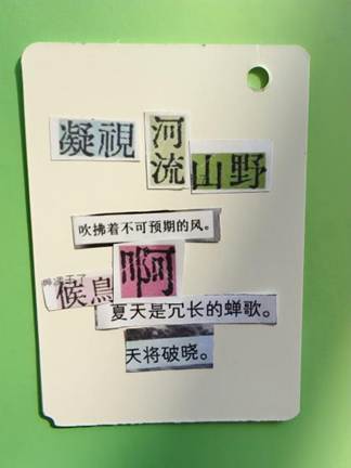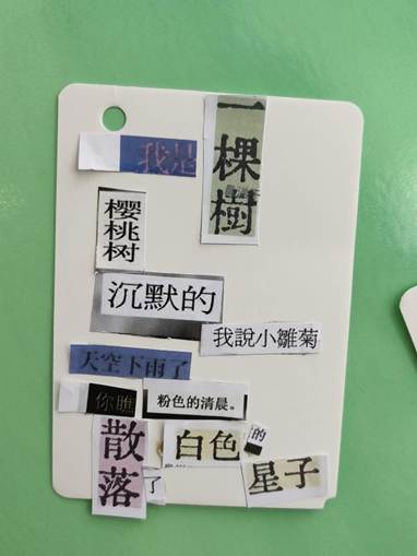 活动的最后,同学们纷纷完成了自己的拼贴诗作品,将精心制作的诗卡在展板上展贴出来。和煦阳光下,一首首别出心裁的诗歌,如同春日绽放的花朵,填满了展板,也温暖着同学们的心。