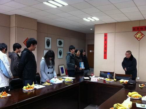 1月2日,天气依旧严寒,飘着零星小雪,但是学校文化中心211接待室却充满家的温暖,我校党委副书记王宇航教授在这里对艺术学院“三联系”学生寝室成员及工商管理学院联系班级的学生代表,进行了“缘来一家人”新年慰问会。