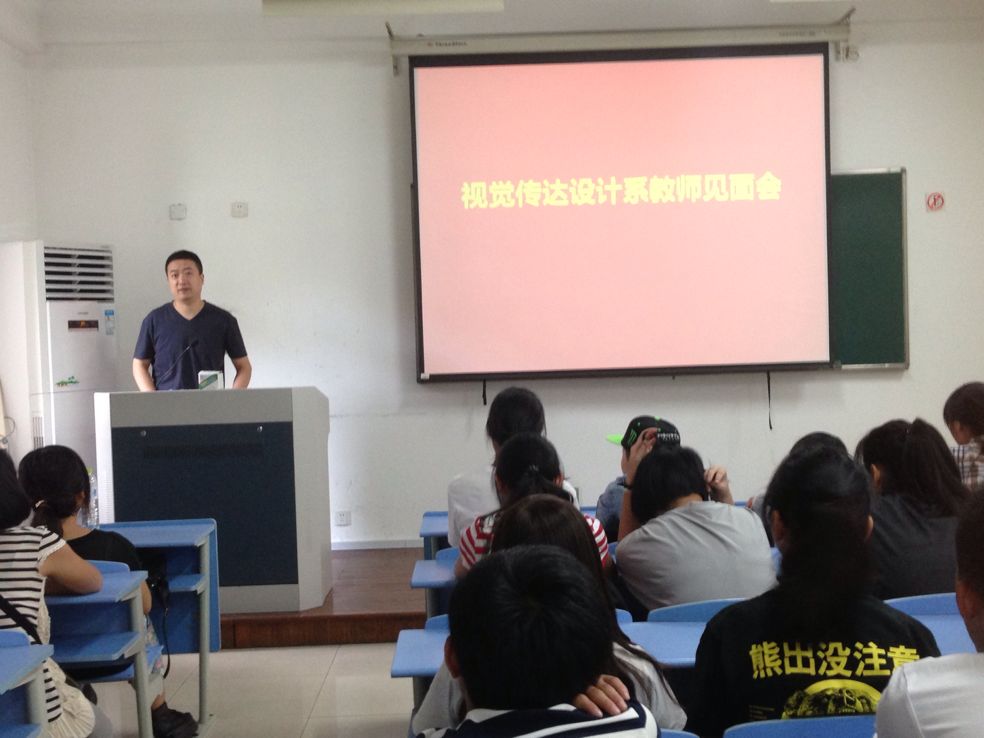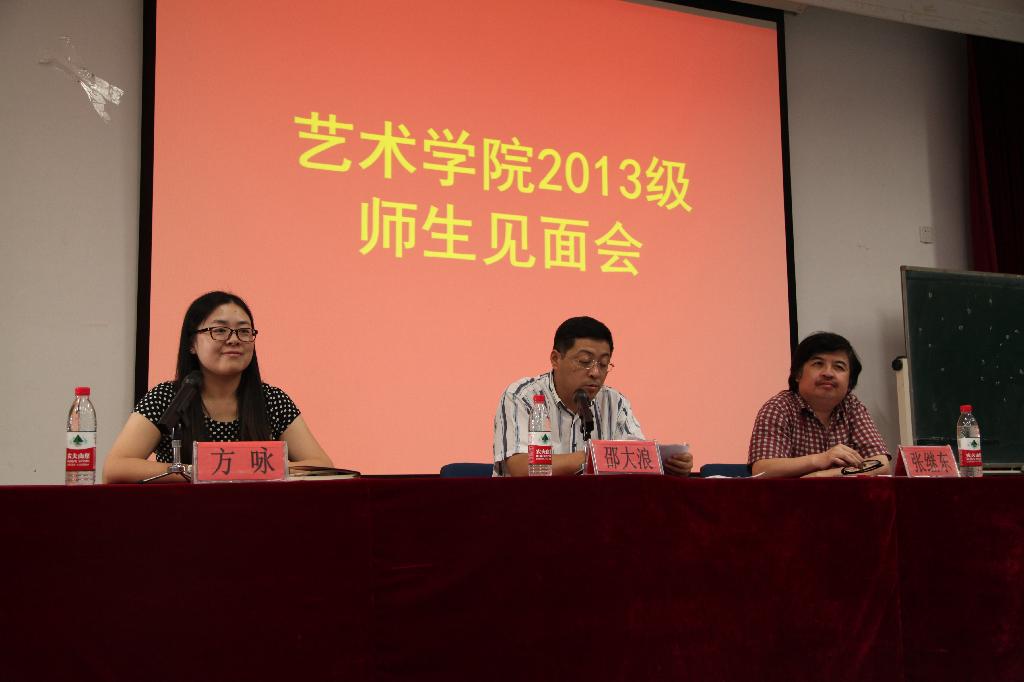 为增强艺术学院师生间的交流,对13级新生表达老师们的关心,艺术学院在教学楼A楼201教室举办了师生见面会。艺术学院院长兼党总支副书记邵大浪老师、副院长张继东老师和学院各系主任、专业老师参加了此次师生见面会,会议由党总支副书记方咏老师主持。会后各专业又展开了深入的交流,专业老师精心制作了ppt,以便同学们更具体地了解本专业,老师们认真负责的态度让同学们很感动,也增加了学好本专业课程的决心。