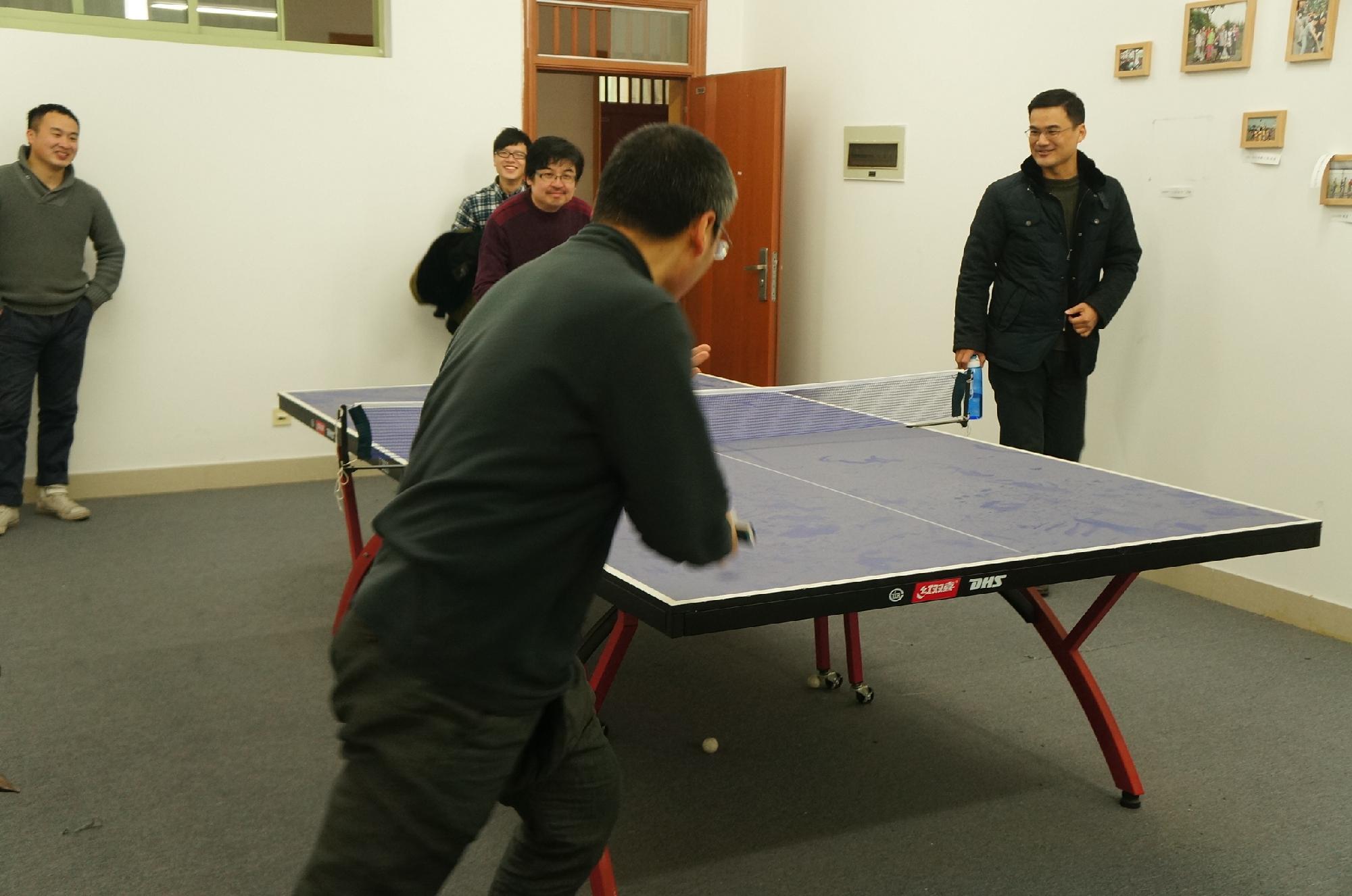一切因陋就简。下午一点,一楼大厅靠边放置的凳子上就摆开了各类运动器具:羽毛球、跳绳、毽子、飞镖……展厅也灯火通明。全院教师齐聚一堂,有的踢毽子,有的转呼啦圈,有的跳绳,有的掷飞镖……一开始,大伙儿都是单干,渐渐的,就都发展成集体项目了:一个毽子在几个人的脚间翻飞,偶尔还会飞出场外,观战的便会毫不犹豫地把它踢回场内;跳绳的一人不过瘾,两人一起;本用于颠球的羽毛球拍挥舞了起来,就在呼啦圈、飞镖、跳绳、毽子之间,见缝插针地捉对厮杀开了;飞镖盘前围了一群人,目标明确,直指靶心,大有不达目的不罢休的气势。没有达标要求,也没有奖品,但是大家都玩得不亦乐乎,笑声不断。还有喜爱乒乓球的老师,更是直接杀向教工之家的乒乓球台,也不顾灰尘,就开始推挡扣杀,让乒乓球在台上留下一串的足迹。