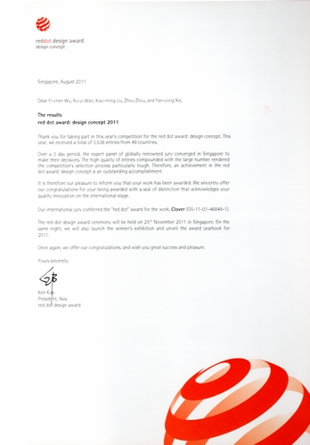 接国际红点设计奖组委会通知,我院艺术设计系教师万如意带领的设计团队以作品“Clover”,获得2011红点设计大奖“red dot award:design concept 2011”。