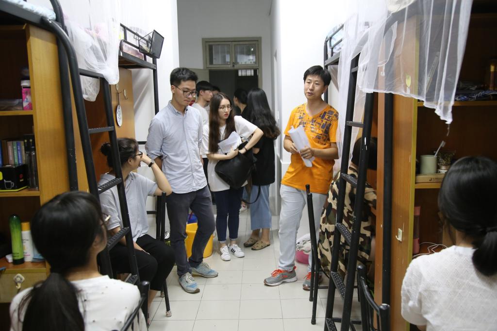 晚上7点钟,田聪老师与14级各班班助走访了新生寝室。他们详细询问了新生的寝室生活问题,也提醒新生注意寝室用电、财产安全等事项。
