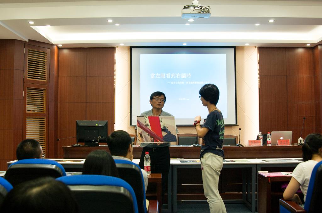 游本宽教授讲座介绍了“美术摄影”、 “观念摄影”等概念,并通过分享他的《台湾房子》、 《法国椅子在台湾》、《镜画 台词》,我的“限制级”照片等一系列作品向大家阐释自己对这些概念的理解,他让我们认识到除了摄影的技巧,更重要的是图片的整理与观念的呈现。游教授还不远千里将自己的并置作品带到现场与同学们分享,与学生们进行了积极互动。