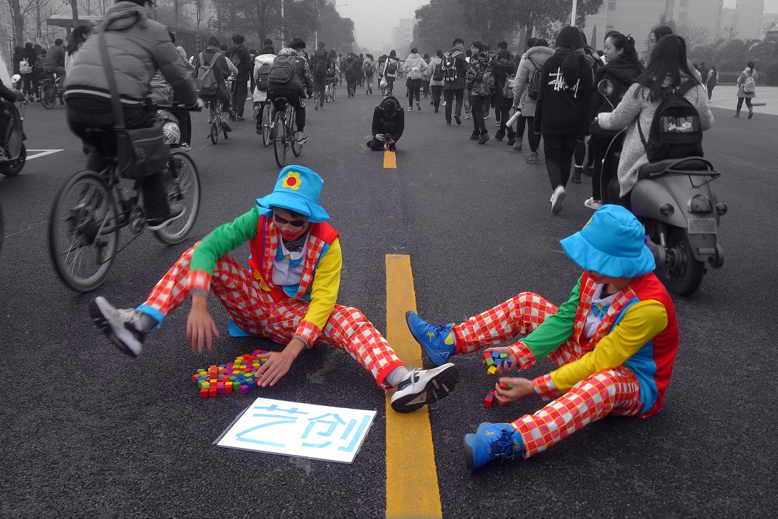 昨日,下沙飘着雨花,空气了透露着一股子寒气,但这丝毫不影响浙江财经大学艺术学院学生在校园内表演行为艺术。而且,这些学生一来就是两三拨。十个学生一字排开,用各种创意画标志、小丑打扮的学生坐在地上搭积木、西装男脸上涂满金色和银色颜料,一动也不动地立在路上……