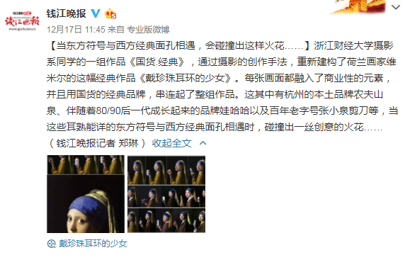 近日,我院摄影专业的一组《国货·经典》摄影作品被钱江晚报等媒体宣传报道。摄影专业的学生在张晓晨老师的指导下,通过摄影的创作手法,重新建构了荷兰画家维米尔的这幅经典作品《戴珍珠耳环的少女》。每张画面都融入了商业性的元素,并且用国货的经典品牌,串连起了整组作品。以下是媒体报道链接: