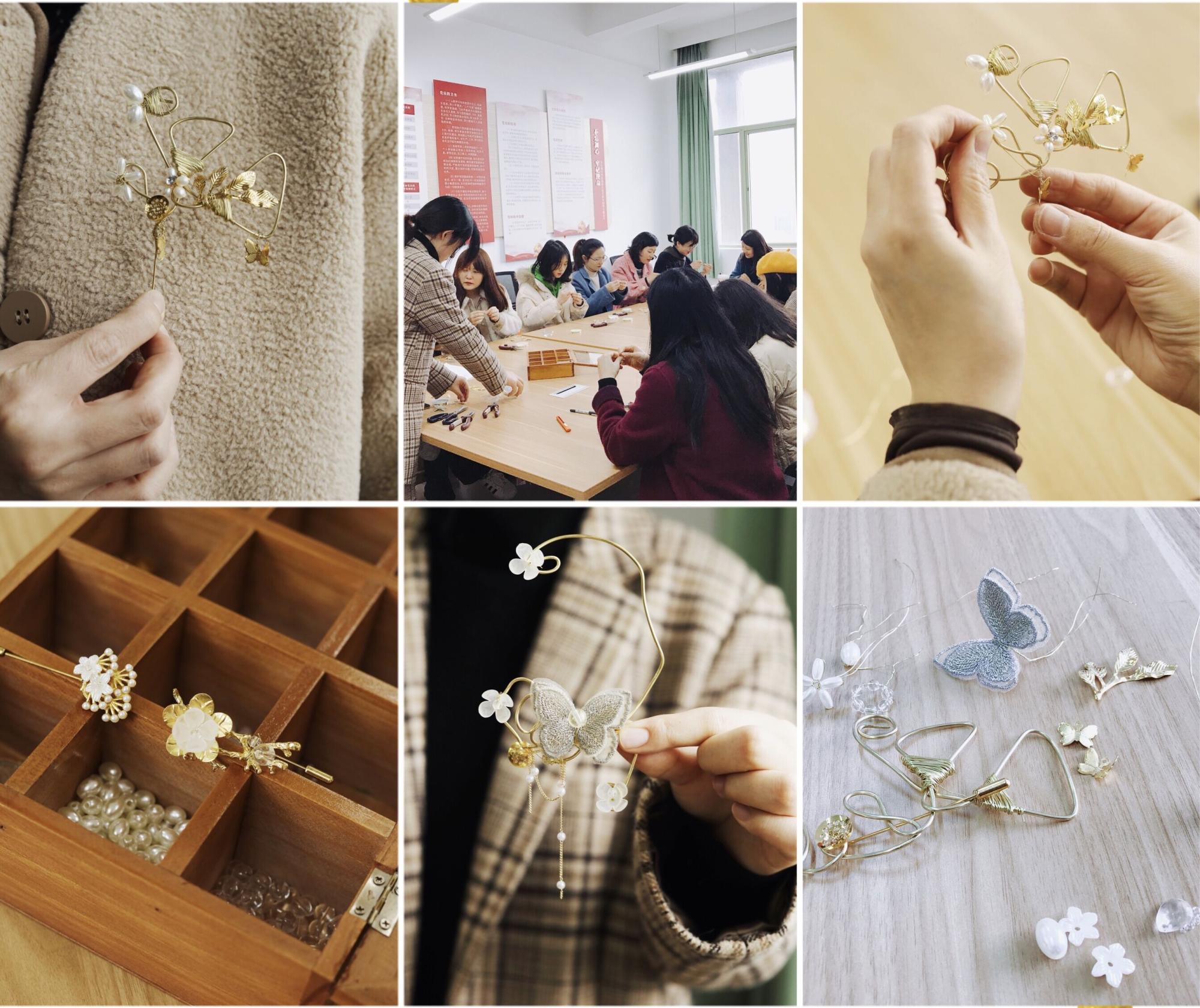 结合省妇联“红船女儿”献礼中国共产党成立100周年系列活动,在深化“巾帼心向党”主题教育活动的同时,提升工作的实效性,艺术学院分工会于2021年3月11日下午,邀请2017届校友郑能回校,为学院女教工开展手工制作“蝶恋花”胸针教学制作活动。2019届校友全程摄影。郑能校友首先为大家讲解了金属胸针的类型、款式等专业知识,随后详细介绍了胸针的制作过程,大家在郑能校友的指导下开始了实际操作。从开始的材料选择到设计定型,每位老师结合自己的喜好,制作出了款式各异的别致胸针。