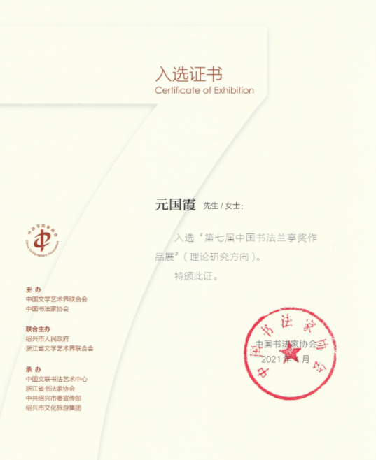 近日,第三十七届兰亭书法节开幕式、第七届中国书法兰亭奖颁奖活动和作品展开幕式等系列活动在浙江绍兴兰亭书法博物馆举行,我院元国霞老师的专著《民国中期京津地区章草书研究》入选“第七届中国书法兰亭奖”(理论研究方向)。