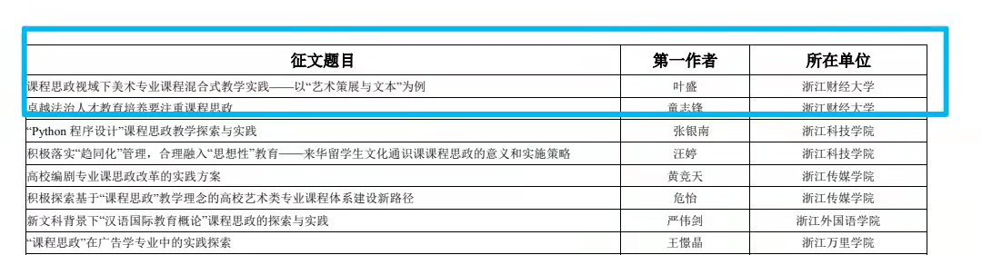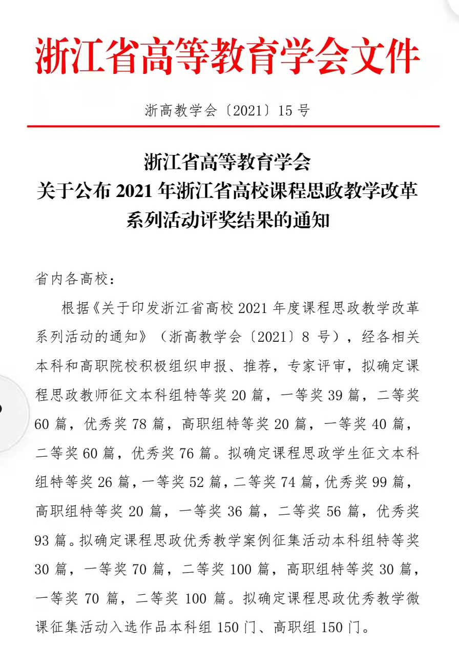 近日,浙江省高等教育学会公布了2021年“浙江省高校课程思政教学改革系列活动”评选结果,我院叶盛老师的《艺术策展与文本》课程案例荣获省课程思政优秀教学案例一等奖,同时“课程思政视域下美术专业课程混合式教学实践”获课程思政征文二等奖。这是我院教师首次荣获该奖项,也是近年我院积极推进艺术专业课程思政建设的成果之一。