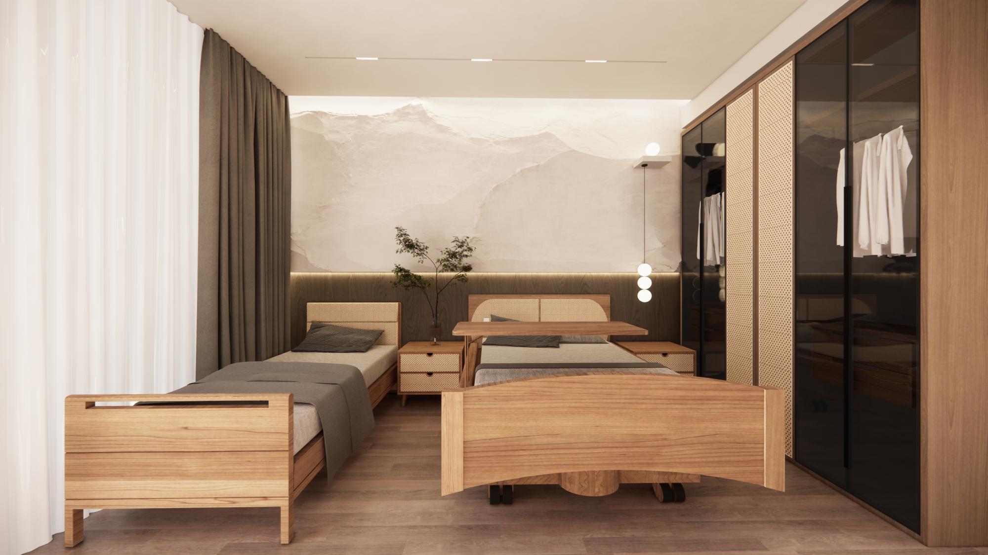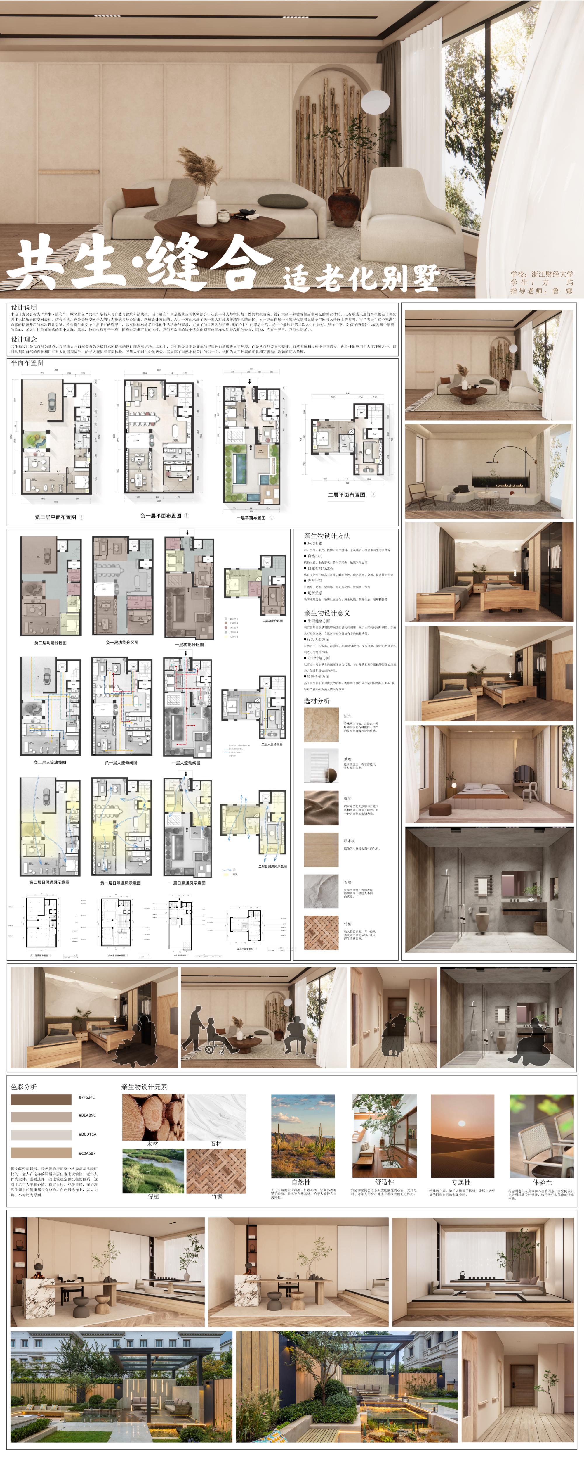 作品简介:作品名为“共生·缝合”,“共生”即人、自然、环境和谐共生, “缝合”即三者紧密黏合,达到一种共生效应。方案主张一种被感知而非可见的感官体验,以有形或无形的亲生物设计理念强化记忆场景的空间表达。基于五感体验,充分关顾空间给予两代老者的行为模式与身心需求。亲生物设计理念的引入,既承载了老一辈人对宅家烟火生活的记忆,又赋予了自然亲和的空间氛围与人情感上的共鸣,以真实自然和抽象自然为基点、平衡人与自然的关系,最终达到自然保护利用和人类健康提升。