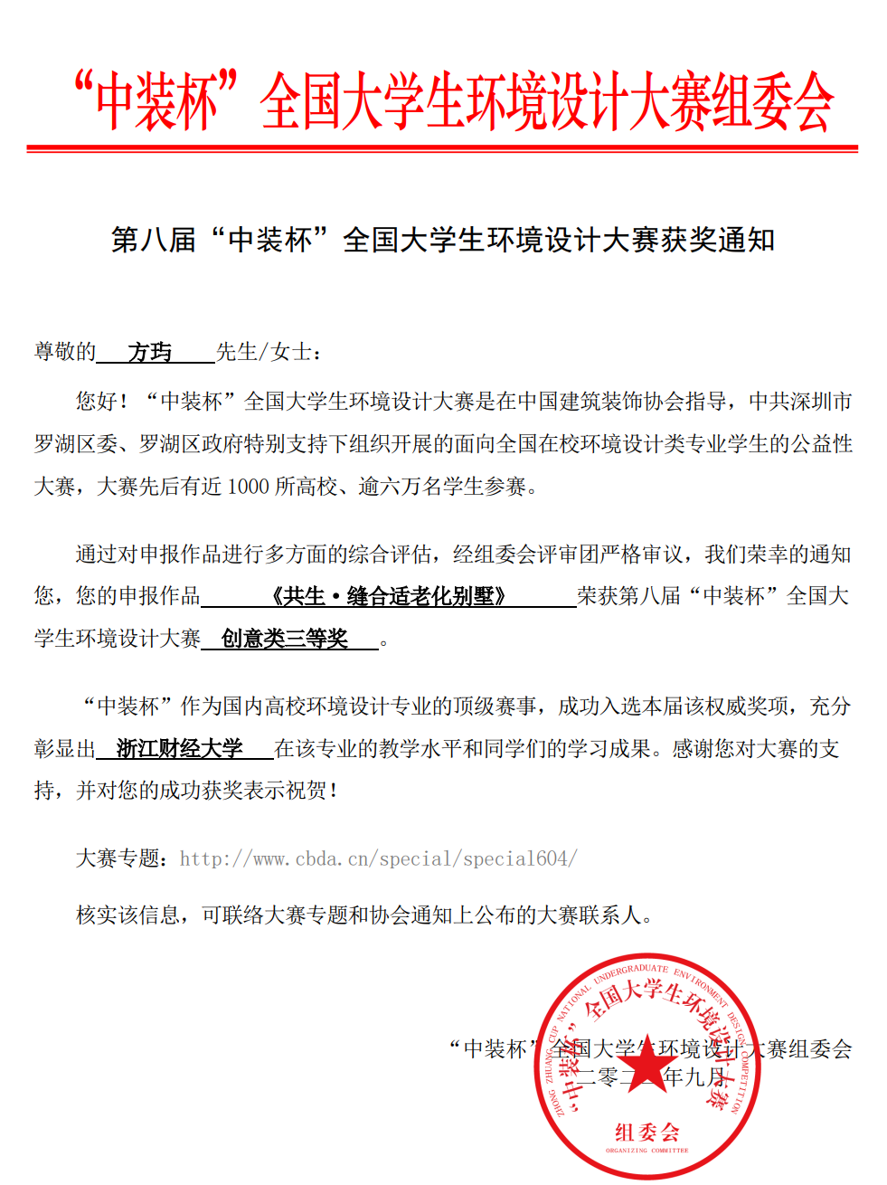2022年9月,第八届“中装杯”全国大学生环境设计大赛决赛落下帷幕。经过初赛、复赛和决赛的激烈角逐和层层筛选,我院2019级环境设计专业方玙同学作品《共生·缝合——基于亲生物设计理念的适老化别墅设计》荣获创意类赛题全国三等奖!