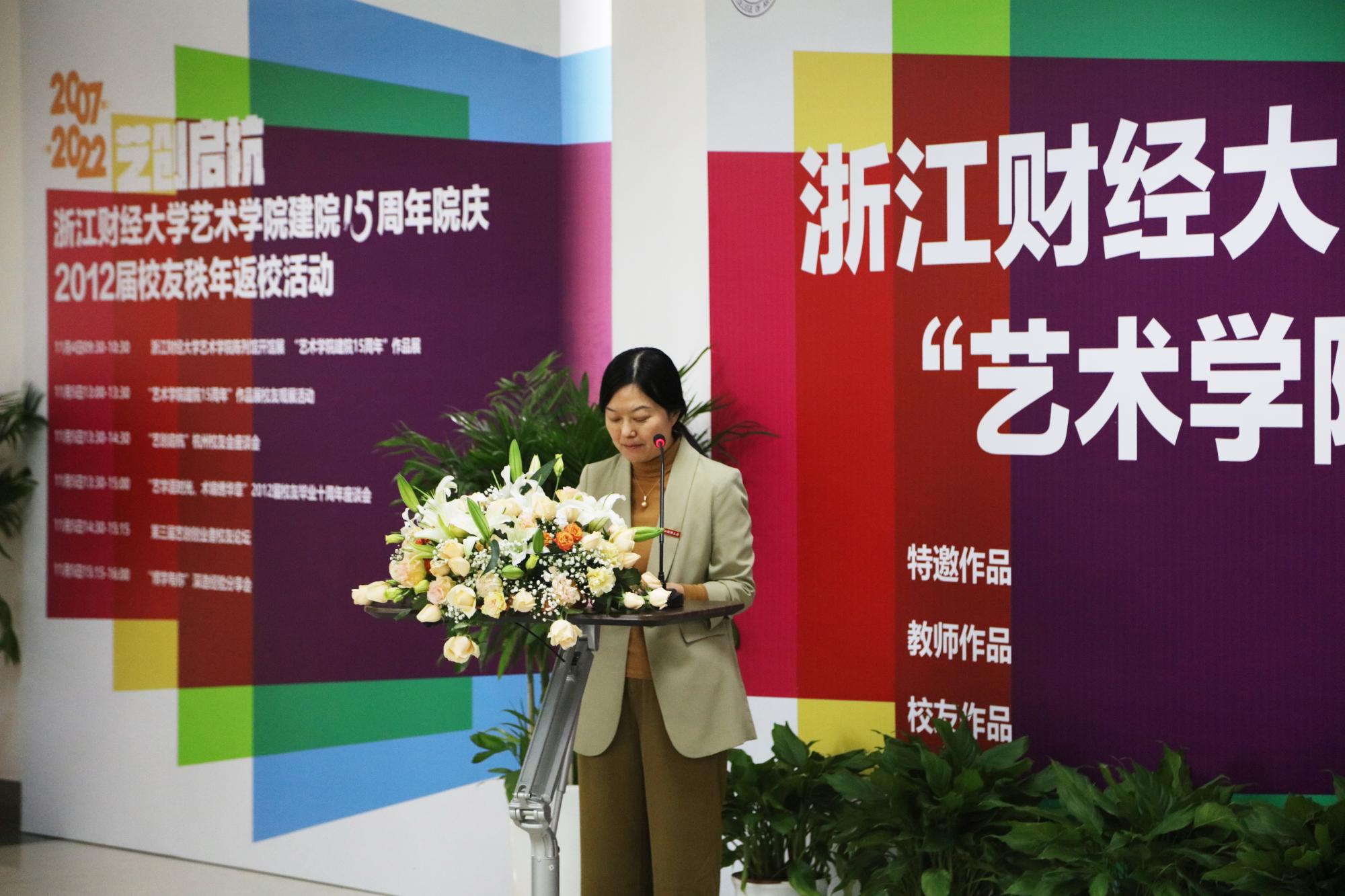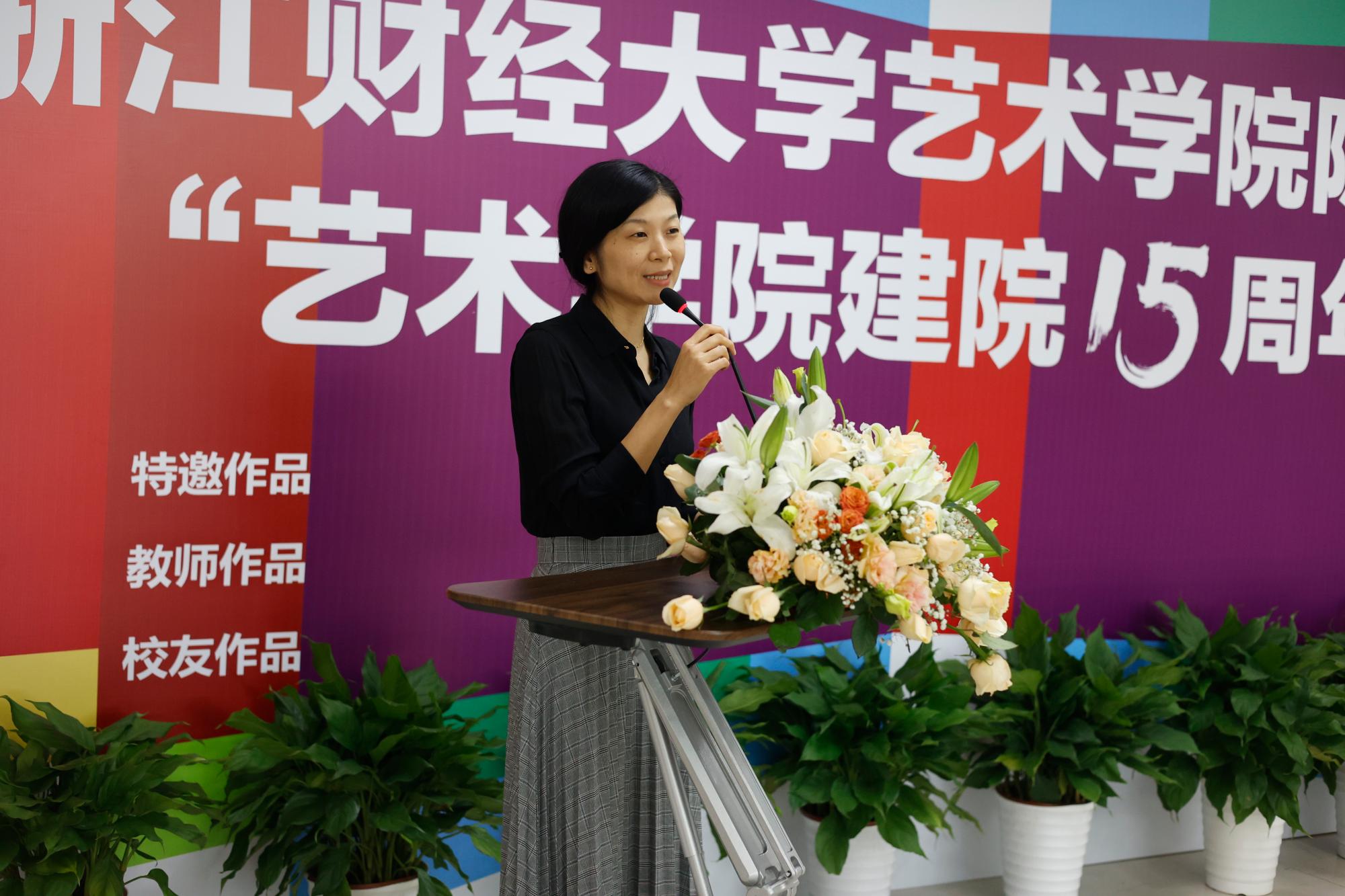 学院教师毛宁代表全院教师为学院十五周年华诞送上祝福。她从自己在艺术学院的从教经历出发,十五年来亲眼见证了学院的建院、成长和发展,感受到了学院领导的励精图治,学院同志们的热情与努力,感恩十五年的成长路能够与大家一起走过、共同成长。同时,对于艺术学院陈列馆的落成开馆,她与大家分享了喜悦之情,并表示陈列馆对于艺术创作和艺术教育走出象牙之塔意义非凡,也将进一步助力学校实现公共美育及文化校园的建设。最后,她祝愿艺术学院能在未来继续开拓创新,追赶超越,再谱华章。
