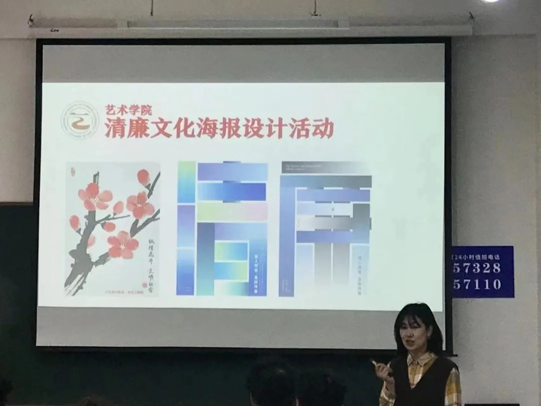 为了进⼀步加强清廉学校建设,将廉洁的种子播撒在师生的心田,让敬廉崇洁之风永驻校园,11月2日下午,艺术学院开展了以“清廉”为主题的宣讲活动。本次讲课由学院陈雅群老师主讲,她围绕如何将艺术教学与清廉教育、校园文化建设更好的有机结合、如何营造“清廉润心田”的校园氛围、如何进行清廉海报设计的主题展开宣讲。