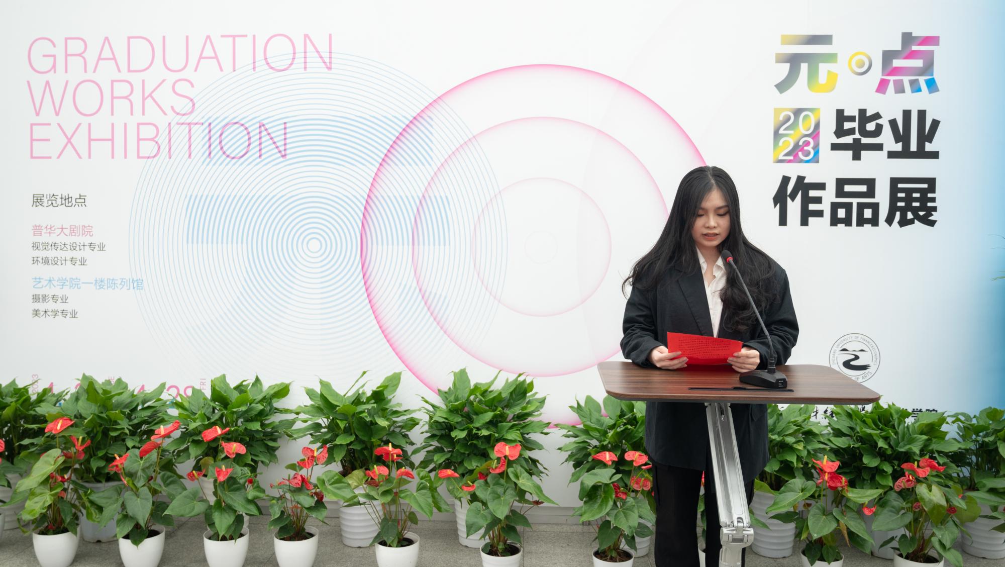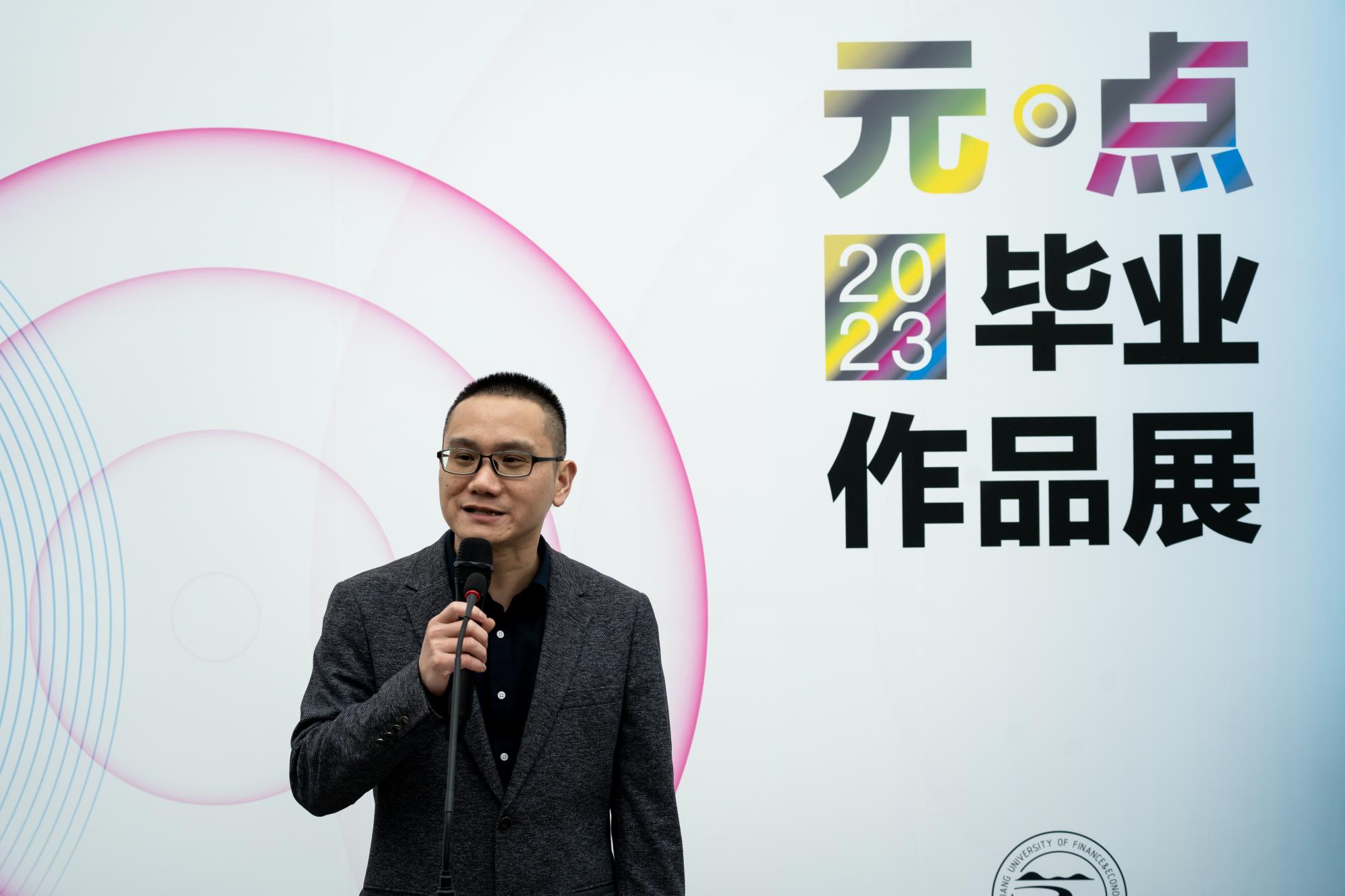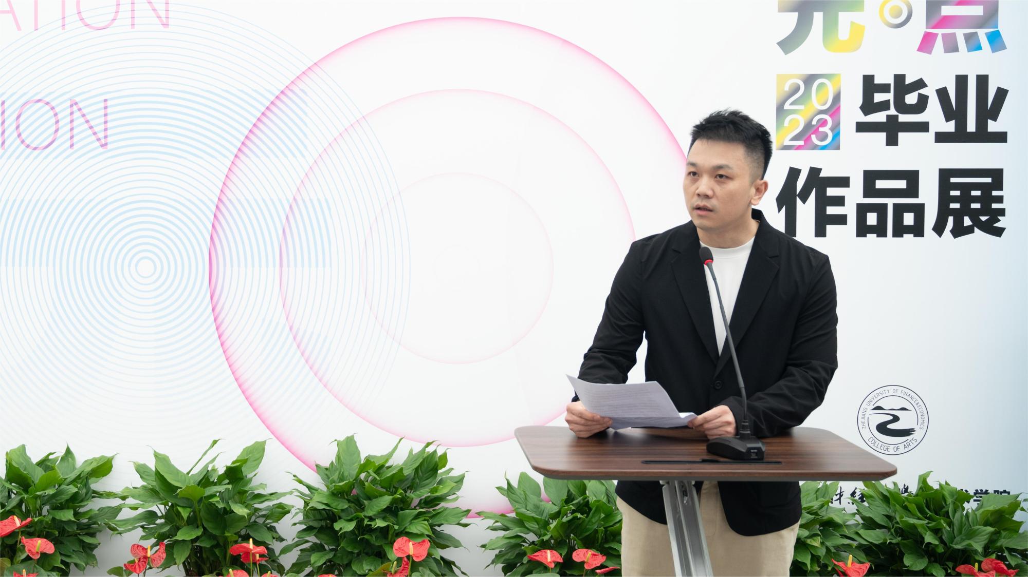艺术学院副院长林洲向学有所成、取得丰硕成果的同学们表示热烈的祝贺并致开幕词。他以“元点”为题,希望毕业生们坚守艺术元始初心,主动承担时代赋予的责任和使命;做充满激情的创造者,元气十足地直面逐梦之旅的考验与挑战;看到未来的无限可能,用开放包容的心态去理解科技更新,多元探索,发挥才干,为国家发展贡献力量。
