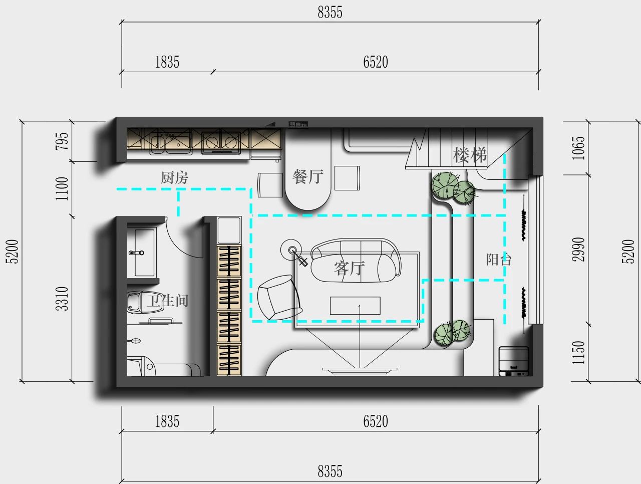 设计理念:本案以摄影中较为重要的“光影”元素为出发点进行设计,通过光线、空间利用和家具搭配等方面综合考虑,打造出一个舒适、美观、实用的居住环境,通过多种不同的手法表达主体物,创造一种新的空间含义,并且将其具体化为点、线、面的建筑语言,使室内空间充满着生动的视觉画面,创造拥有镜头感的室内空间,从而为室内设计增添更多的体验和活力。