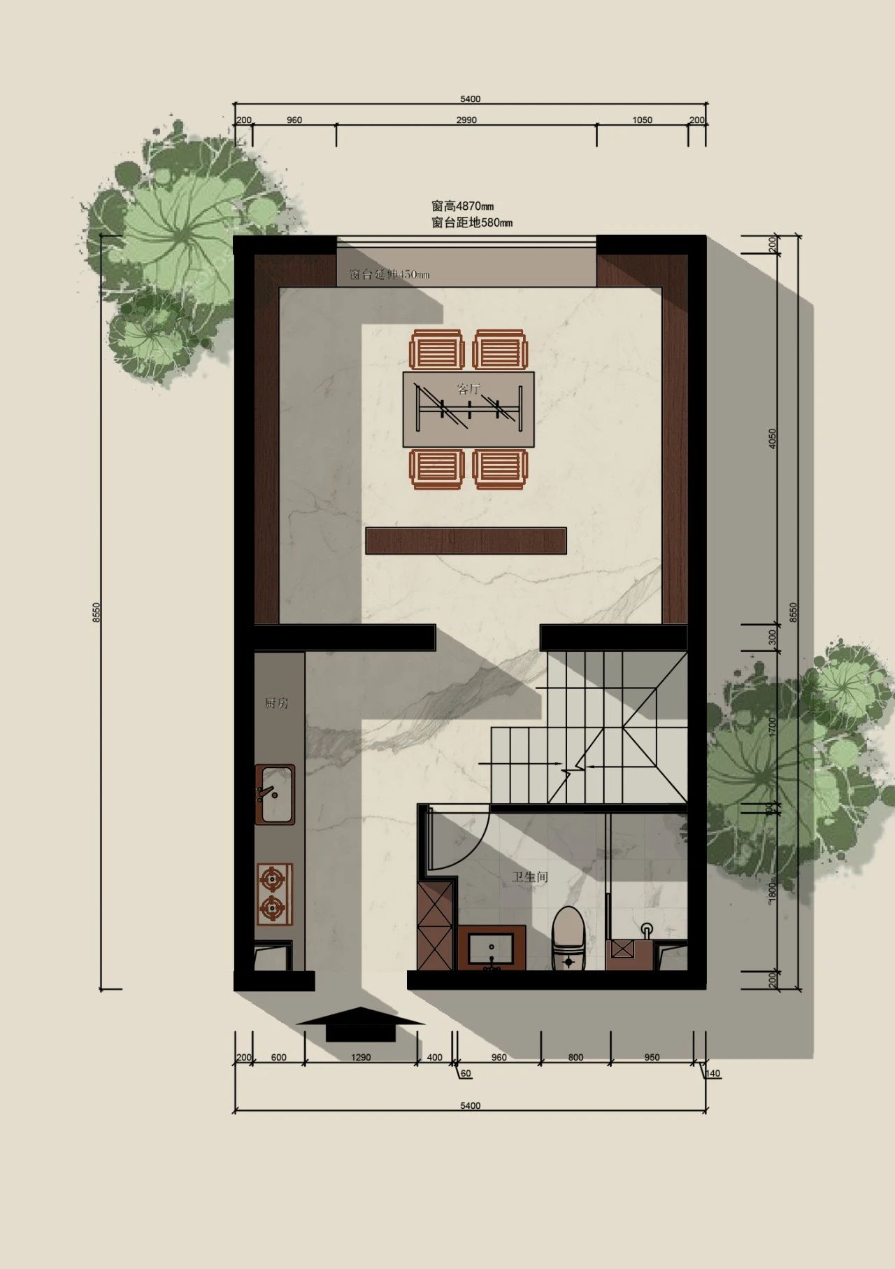 设计理念:该案以杭州钱塘区乡村振兴示范村江东村为基地,选取江东村极具代表性的花卉景观园区作为方案切入点,将花卉中心区处一幢坡屋顶建筑,改造为集可再生能源(太阳能、风能)与阳光房结合的,集盆栽鉴赏、文化长廊、商业洽谈于一体的花卉植物园展示建筑。建筑外立面为玻璃幕墙,展示区域具备阳光房的功能,内部清水混凝土实体建筑作为商业洽谈区域。方案的技术创新点:1、阳光房空调能耗源于绿色建筑设计中的太阳能光伏建筑一体化。2、团队运用净化水体的花卉实现中水循环可再生净化系统。3、中央景观楼梯设计将绿色屋顶和花卉展示合二为一。该案结合了杭州地域特色和自然景观优势,利用绿色建筑与可再生能源技术,展现了设计团队乡村建筑改造的创意和凝聚力。