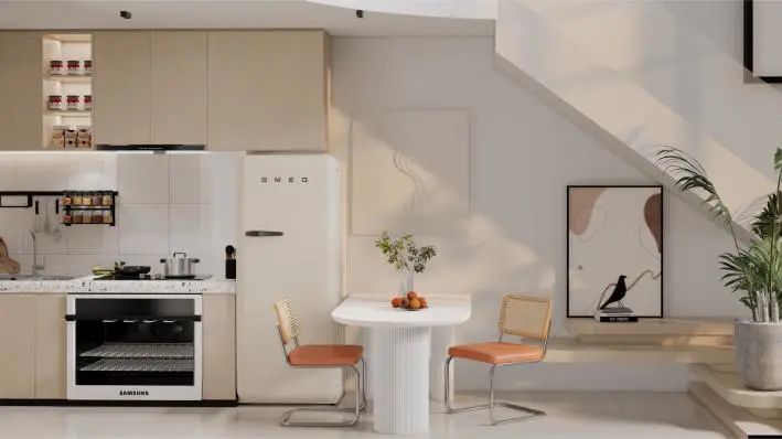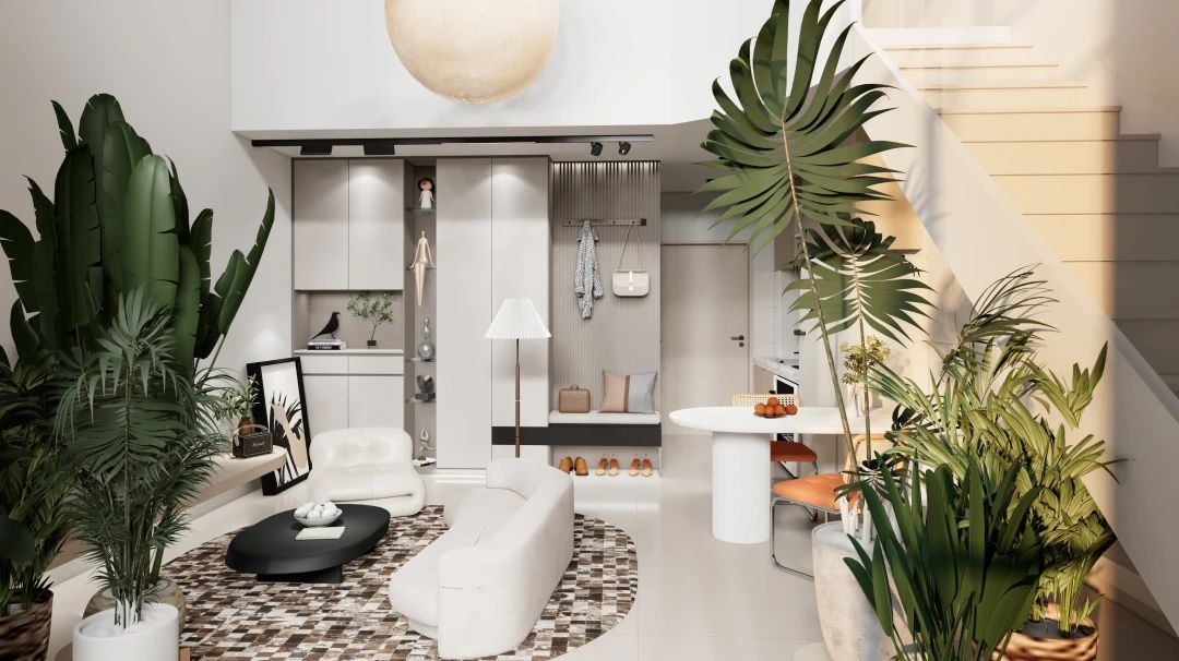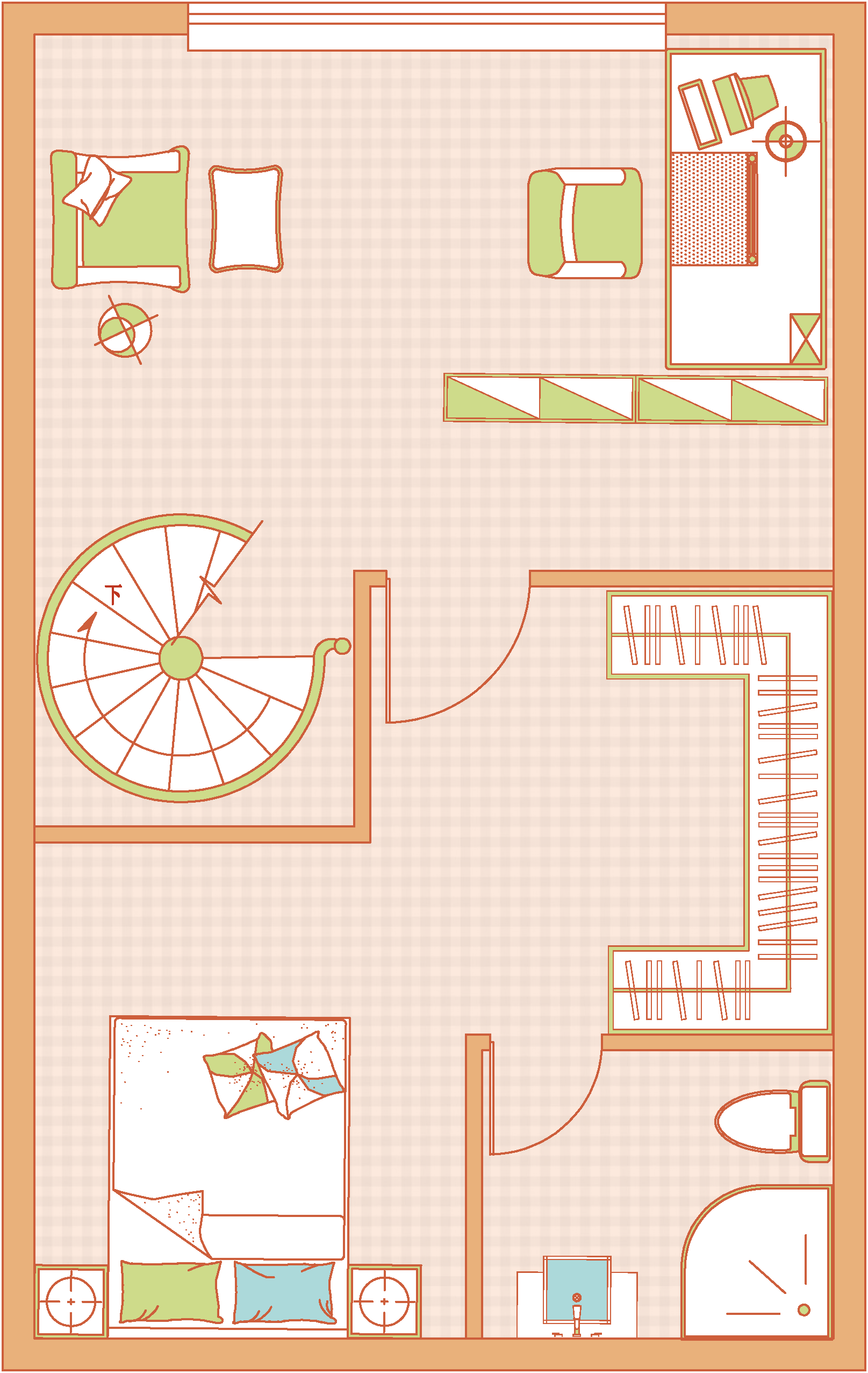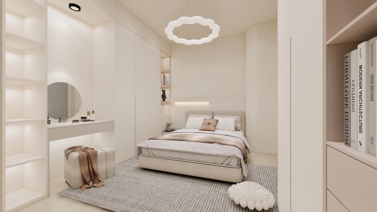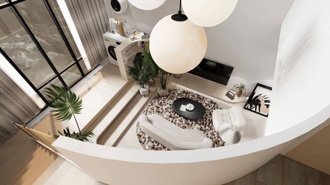 设计理念:万目攒视,见有勾萌出,渐大;俄成树,枝叶扶苏,倏而花,倏而实,硕大芳馥,累累满树。每位单身女性都是一株蓄势待发的树苗,在灯火喧嚣的城市里,树苗需要在参天大树的庇护下恣意而生。本案是一套为单身女性打造的高质量公寓空间,它即为参天大树,树屋提供满满的安全感与舒适感;树洞提供足够的收纳空间;果实提供安静的办公学习空间,让个人的内在提升永不停息;绿叶寓意自然,让居住者在钢筋水泥空间中触摸清新和自然。