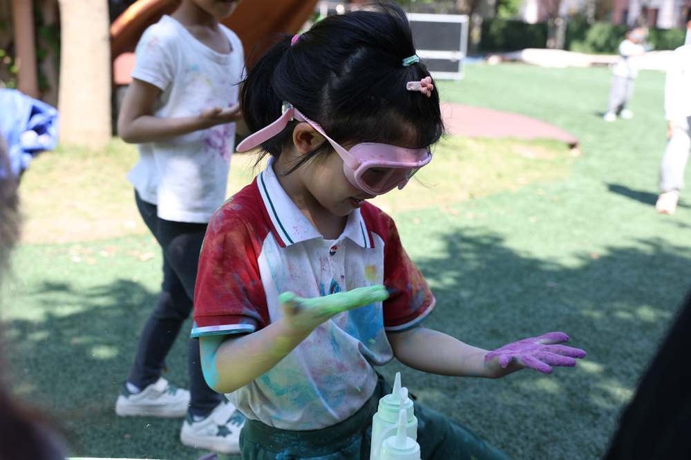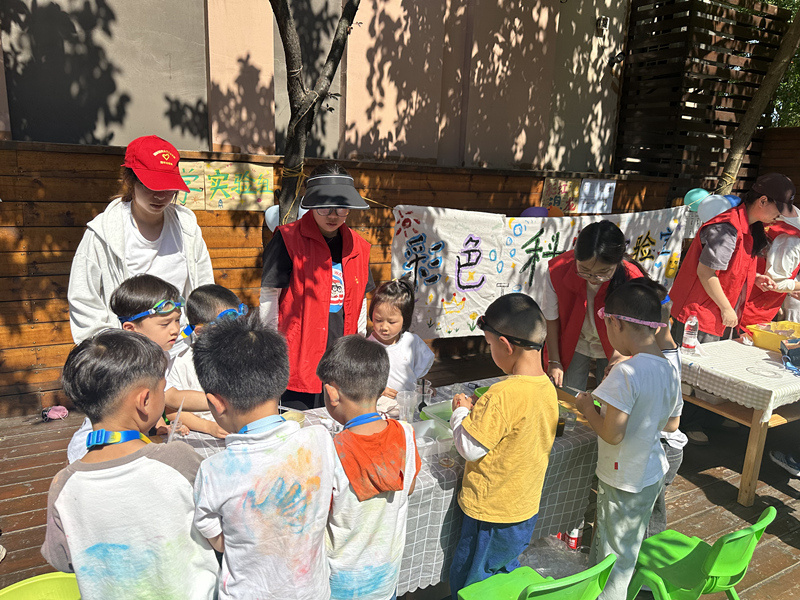 首站中,小朋友们体验到了用扭扭棒制作簪花的乐趣,感受中华文化的魅力以及自主涂鸦创作一件独特的时装;随后来到“穿越彩线”,在大学生志愿者们的保护下,小朋友们穿过彩线区进行冒险,在彩色隧道中自由穿梭;在“彩色下雨天”活动中,小朋友们进入透明膜空间后自由的在透明膜上涂抹颜料进行绘画;末站的“瓶子中的彩虹”活动中,小朋友们在大哥哥大姐姐的帮助下用水瓶吹出一个个“泡泡龙”,并观察瓶子中出现的彩虹现象,在欢乐中学习到科学知识。