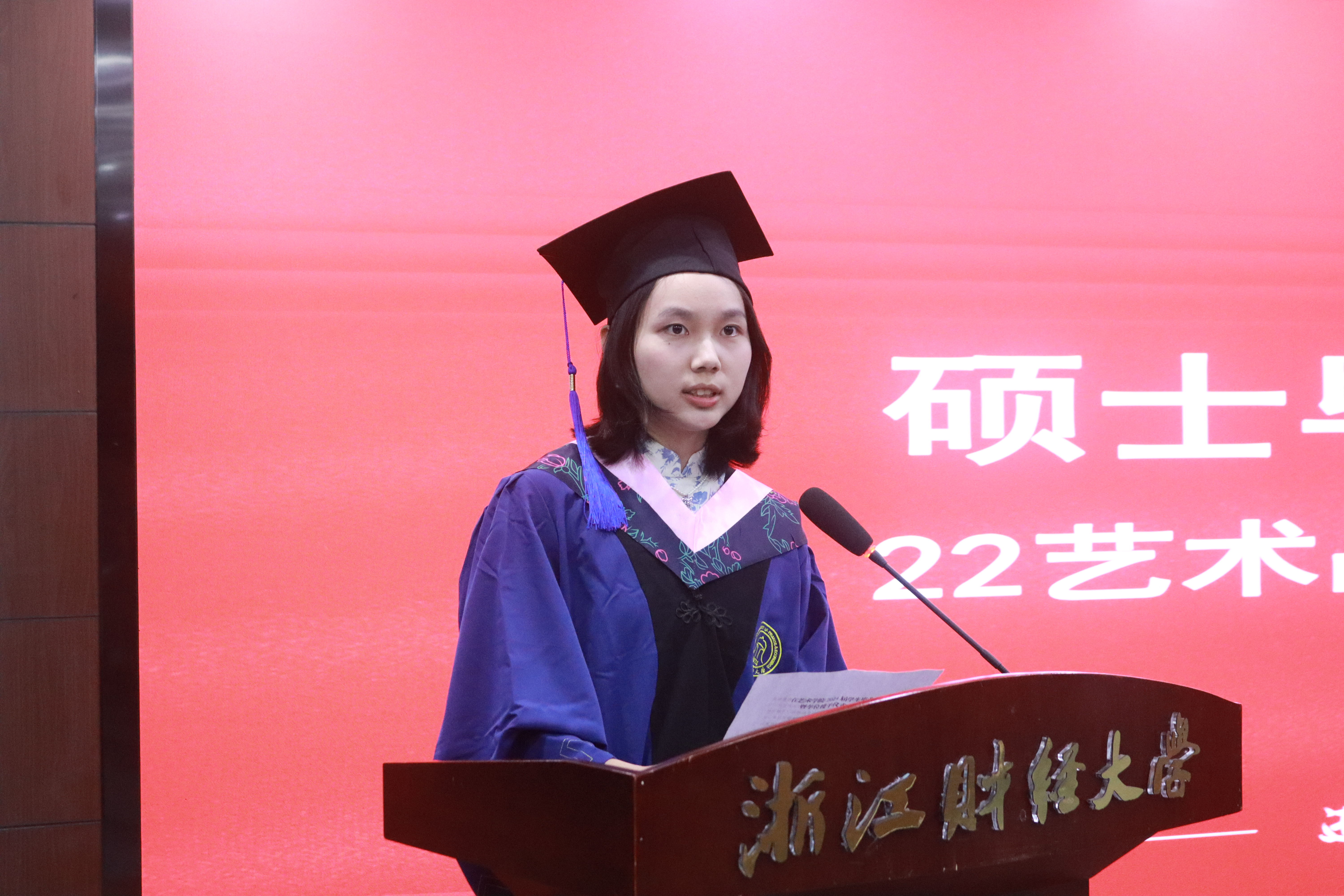 毕业研究生代表、22艺术品市场与管理专业姚怿冉分享了从“照搬知识”到“独立思考”,从“依赖答案”到“理解问题”的深刻成长,祝福毕业生们以看待问题的眼光,解决问题的能力,不惧未知、保持好奇的精神,成为自己学习与生活的引路人。