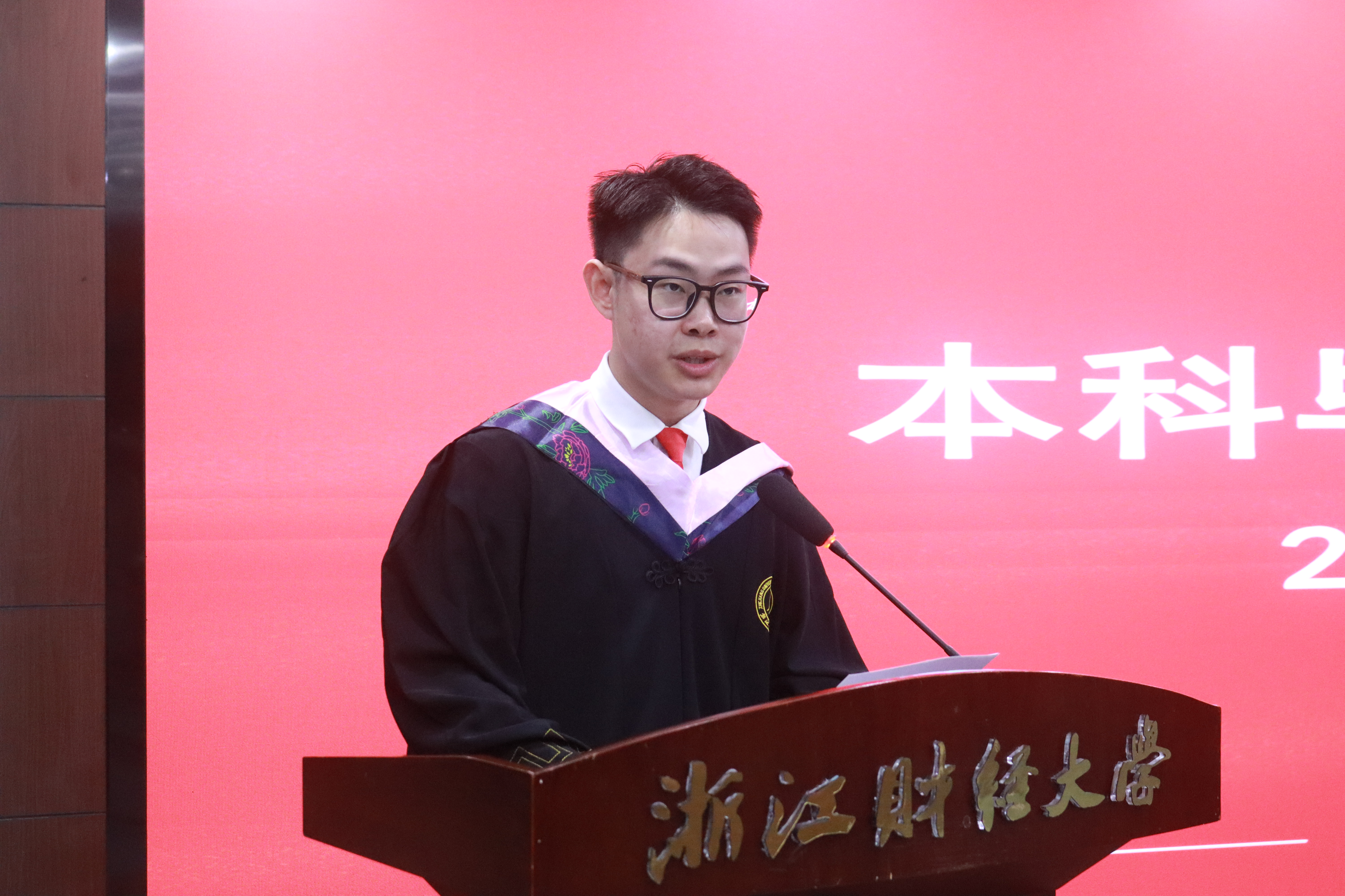 毕业本科生代表、21环境1班余点以幽默风趣的语言分享了自己的求学经历与收获,并勉励同学们敢于行动,勇于尝试,希望大家能够在困难中越挫越勇,丰盈自我。