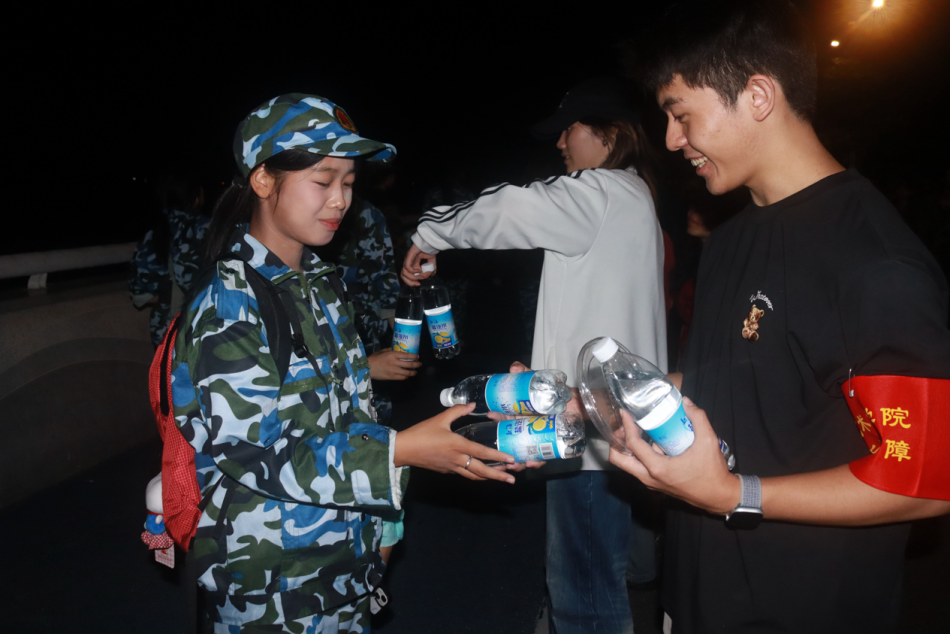 在每一处补给点位,43名志愿者不畏夜深,准备就绪。他们热情地招呼着行进队伍,将饮用水和能量包递到大家手中,为参训学院们加油鼓劲,同时安排专人悉心照顾身体不适者,全程陪护,提供坚实的后勤保障。