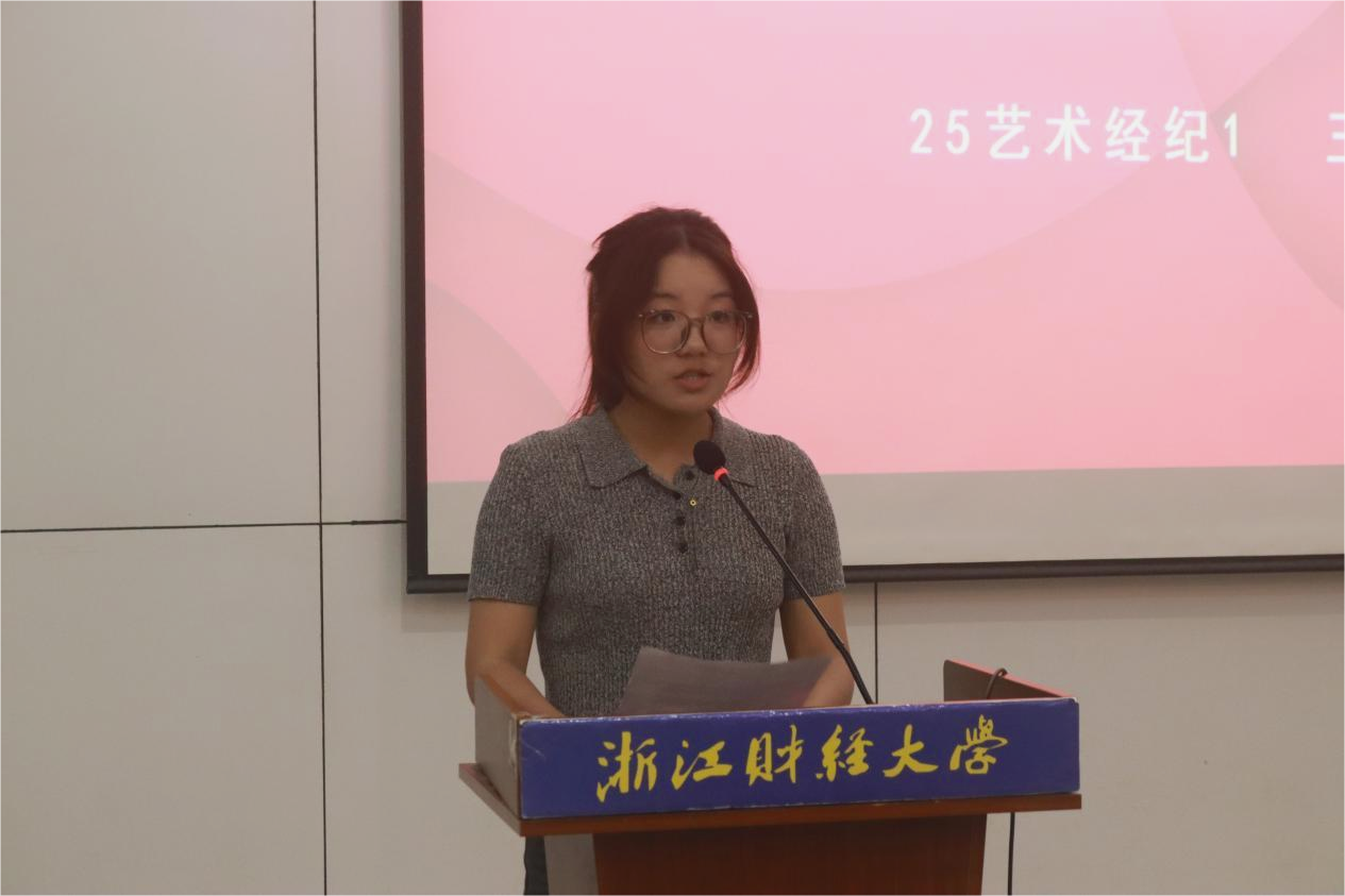 随后,25艺术经纪1班王心程作为新生代表发言。她表示,站在人生的新起点,如何把对艺术的热爱变成实实在在的能力,是大家要一起探索的方向。希望未来能与老师和同学们一同成长,学习用艺术的眼光理解世界,用创作的态度面对人生。