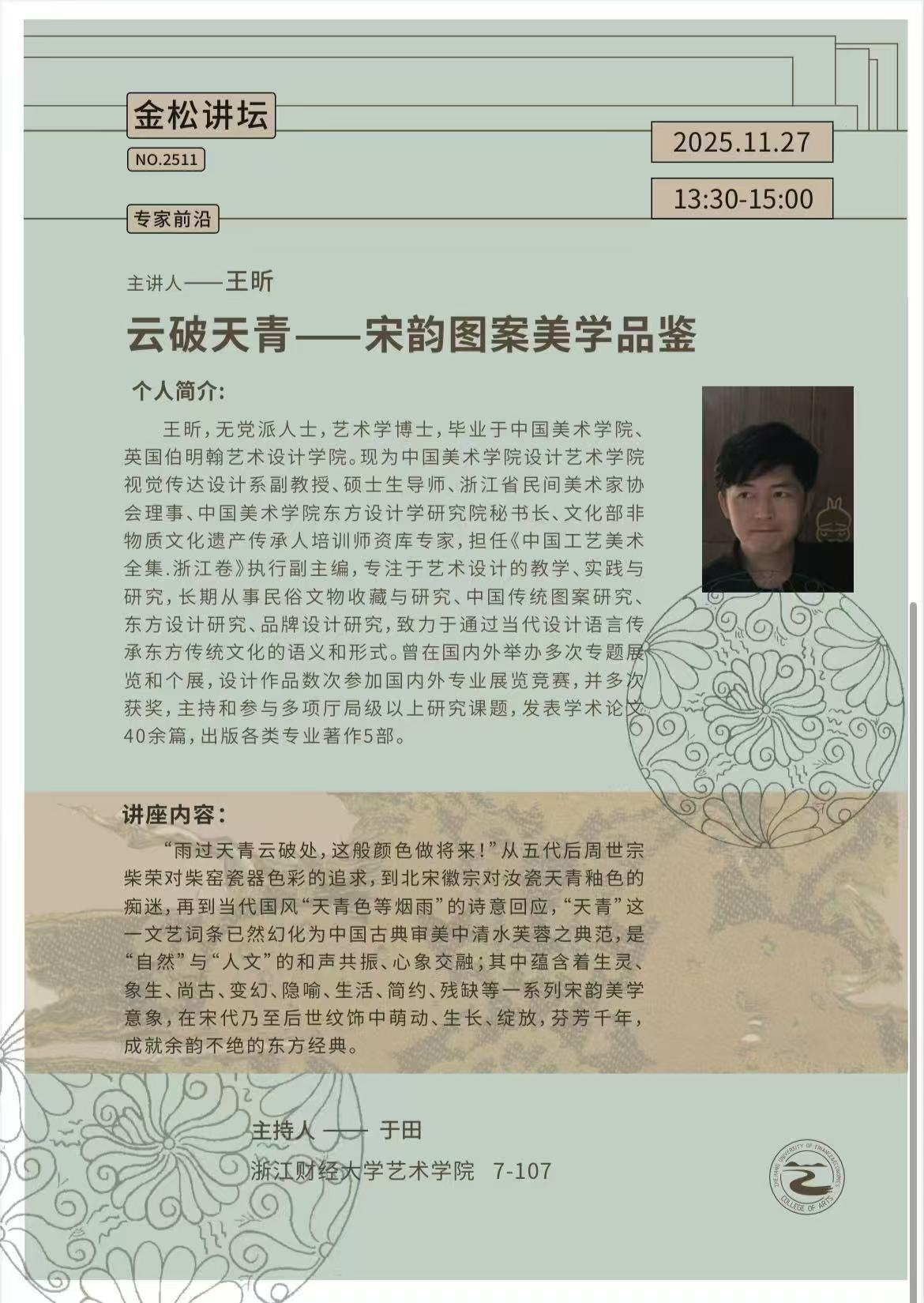 11月27日,我院特邀王昕教授开展主题为“云破天青—宋韵图案美学品鉴”的学术讲座。从宋代美学视角切入,以“天青色”的审美意象为核心展开深度探讨,为学院师生带来一场融合文化之美与设计思维的学术分享。