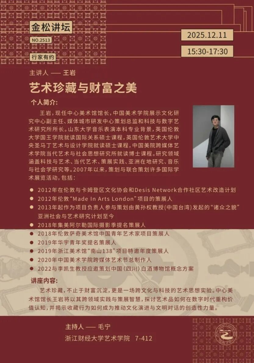 12月11日下午,艺术学院金松讲坛系列讲座《艺术珍藏与财富之美》在7号楼412会议室顺利举行。本次讲座特邀中心美术馆馆长王岩老师担任主讲,艺术学院副院长(主持工作)毛宁主持讲座。学院美术学系主任叶盛老师,史劼、杨一隽、柳贞娥等青年教师,艺术经纪方向本科生与艺术管理方向硕士生共同参加。讲座聚焦艺术与财富的深层联系,探讨了艺术品收藏在历史演变中的多元角色及其当代价值,为现场师生带来了一场跨越艺术、经济与社会学的思想对话。