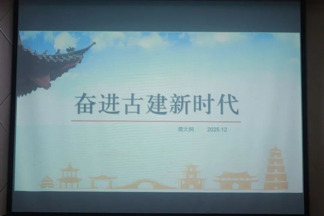 12月18日下午,艺术学院金松讲坛系列讲座《奋进古建新时代》在7号楼412会议室顺利举行。本次讲座邀请临海古建工程有限公司董事长黄大树教授,进行了主题为“奋进古建新时代”的学术讲座。艺术学院专聘副院长王羽代表学院欢迎黄大树教授的到来,并致欢迎词。讲座由环境设计系国增林老师担任学术主持。学院环境设计系教师代表鲁娜、李瓯,部分环境设计系学生共同参加。讲座围绕中国古代建筑的深厚底蕴与当代传承发展这一核心议题展开,带领在场师生进行了一场穿越时空的古建文化与美学的思想对话。
