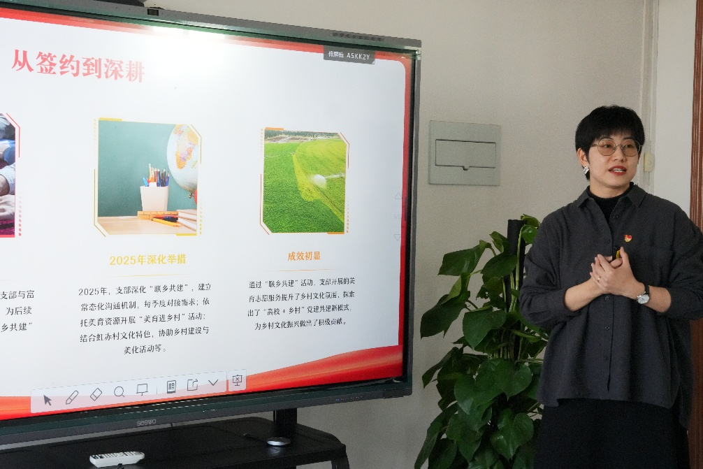 六位党支部书记依次述职,全面总结回顾2025年度党支部工作情况,亮成绩,找差距,谋思路,促提升,展现出鲜明的责任担当与务实的工作作风。汇报中,各支部聚焦党建引融、理论溯源、美育实践,“一支部一品牌”建设,服务国家重大战略等重点工作内容,充分交流了经验心得,进一步明确了改进方向。