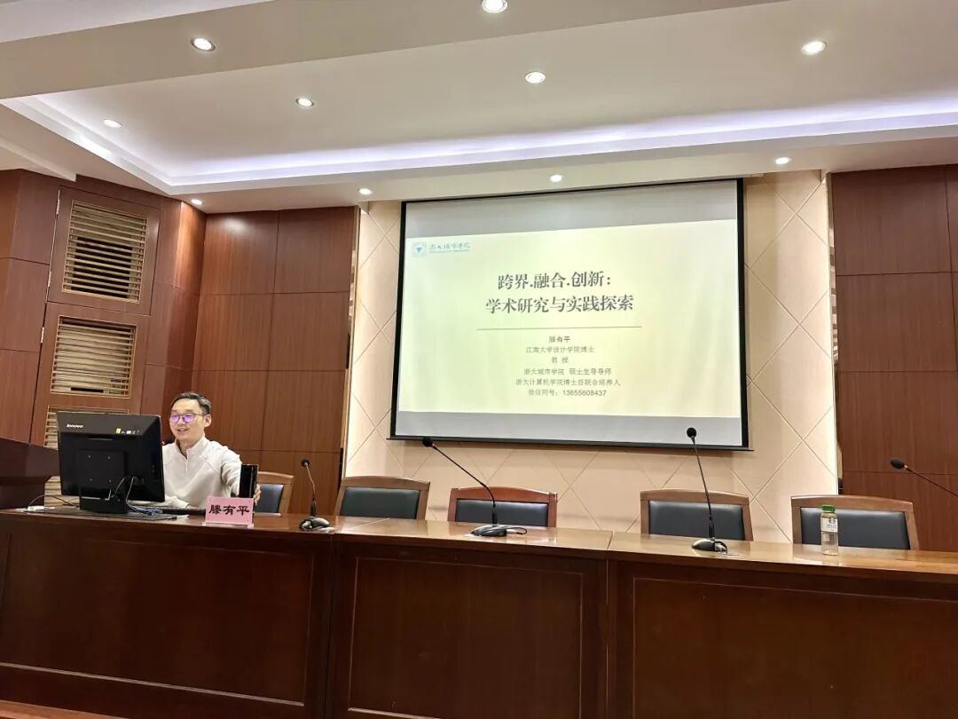 讲座中,滕有平博士以工学与艺术交叉为核心视角,系统拆解了跨界研究的思路与实现路径。他立足浙江及江南地域文脉,生动阐释了如何将传统空间与文化符号提炼为学术课题与设计成果,结合自身参与的历史街区更新、品牌策划等实践案例,详细讲解了学术研究、设计创新与市场应用的融合逻辑。