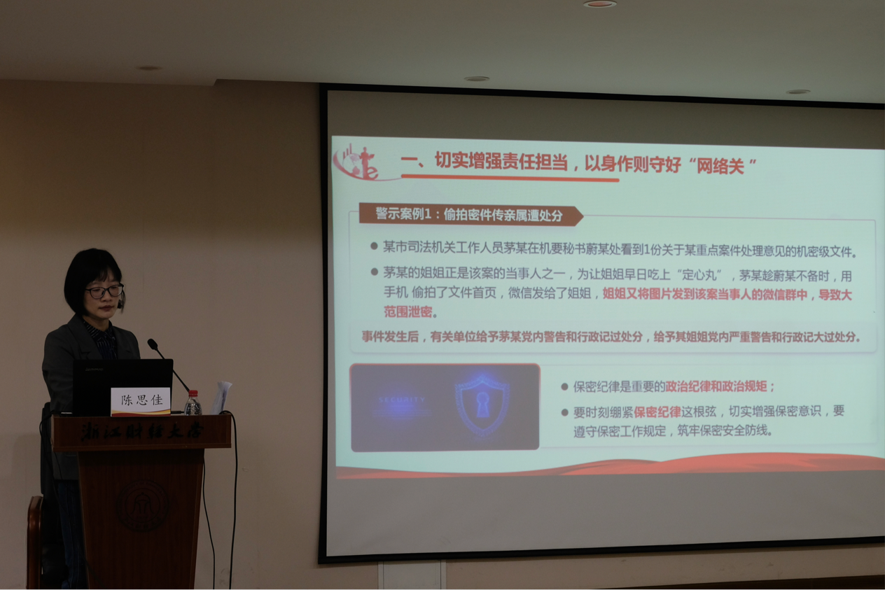金融学院党委副书记陈思佳以“云端筑梦,青春担当——大学生网络素养与正能量传播”为主题,聚焦大学生网络行为规范,倡导学员主动传播正能量,争做清朗网络空间的倡导者、建设者,以青年之声传递正向价值。